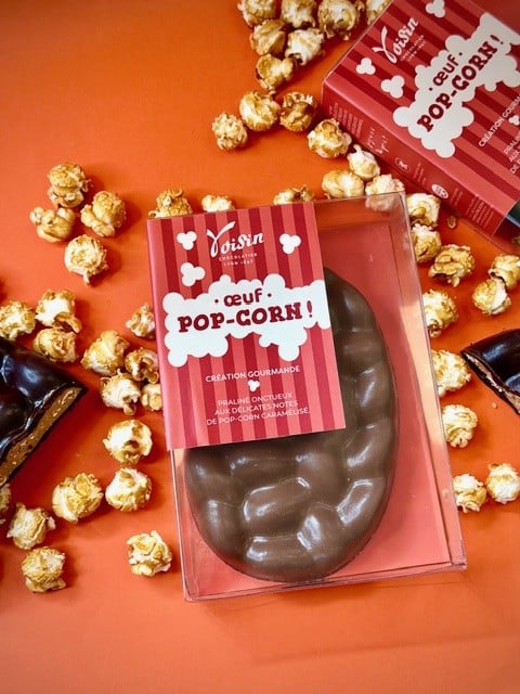 Pour cette édition de Pâques, la maison lyonnaise propose un œuf qui associe un praliné fondant à des éclats de pop-corn croustillants, le tout sous une coque en chocolat noir ou au lait. Avec cette recette, Voisin cherche à renouveler les codes d’un marché très concurrentiel, où l’innovation produit devient un levier important de différenciation.